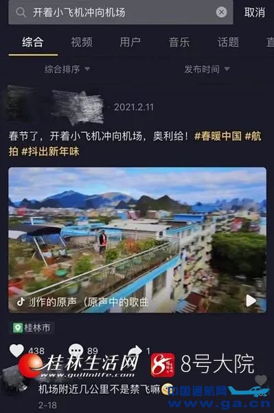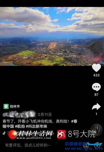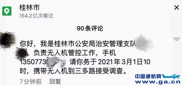 “你好,我是桂林市公安局治安管理支队某警官,负责无人机管控工作,手机号码1350773****,请你务于2021年3月1日10时,携带无人机到三多路接受调查。”近日,一条视频刷爆了桂林的朋友圈。在此条视频大火的同时,一则留言引起了大家的注意。这条视频是某网友于2021年2月11日发布,在机场放飞无人机的视频,并配有文字“春节了,开着小飞机冲向机场,奥利给!”。