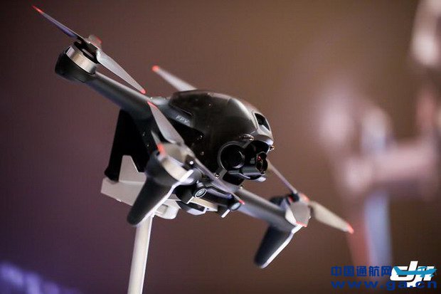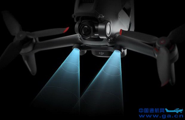 DJI FPV穿越机前方、下方搭载感知系统用于避障,同时前方起落架有红色指示灯,底部有高亮度白色补光灯,保障飞行安全。