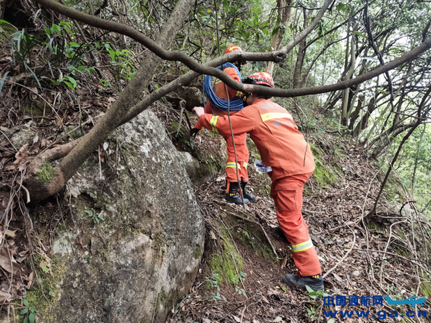 ![]() 行进过程中,消防员带着山岳救援装备慢慢探索上去,沿途做好标记,开辟救援道路。救援队伍徒步行进了大约一个小时,于下午2点40分终于找到被困男子,此时他躺在地上,意识比较清醒,只是身体有些虚脱。