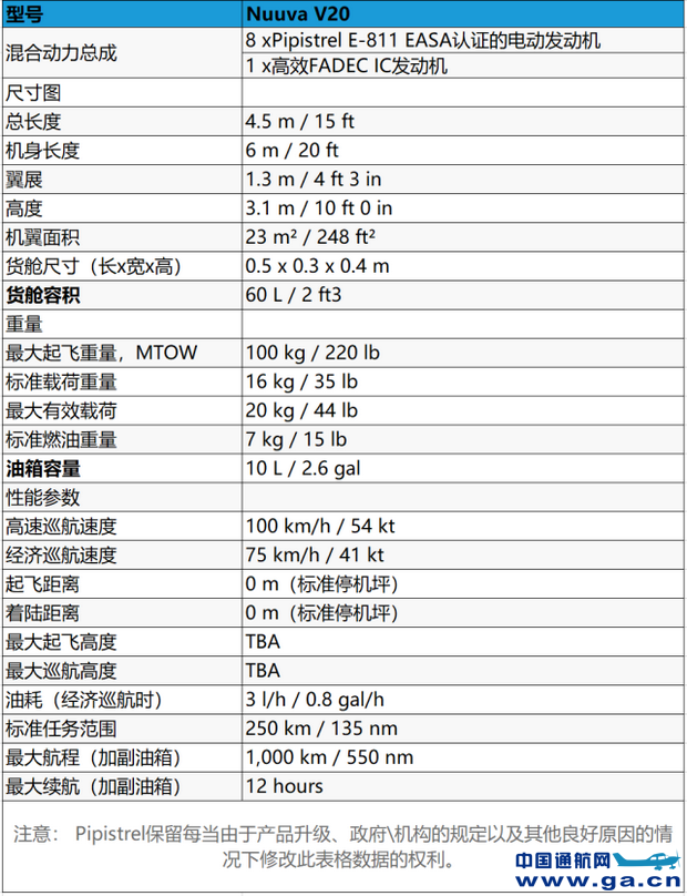 ![]() 2020年6月10日,欧洲航空安全局(EASA)宣布对蝙蝠飞机制造的Velis 电动飞机正式颁证,这是全球首架全电动飞机获得EASA认证,也是可持续绿色能源航空的重要里程碑。作为电动航空适航认证的先驱,蝙蝠飞机Pipistrel将 Nuuva V300作为Nuuva系列无人机的旗舰机型。该机型旨在将电动动力垂直起降 载具商业化,根据此前披露的信息,该机型高度定制化,可携带高达460公斤货物,操作简单,运营经济性高,提供可靠高效的电力总成。垂直起降(VTOL)功能使它能够到达其他飞机无法到达的地方,而如今改制为混合动力的配置也将允许它在同等任务条件下以直升机运行成本的很小一部分进行运行。