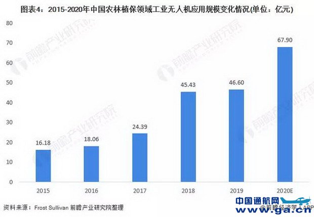 2015年以来,我国农林植保领域工业无人机市场规模逐年上升,2019年达46.60亿元。在疫情、春耕、5G等多方面因素影响下,2020年植保无人机再度迎来爆发,不管是无人机数量、种类还是应用、市场都实现跨越式发展,2020年市场规模约达67.9亿元。