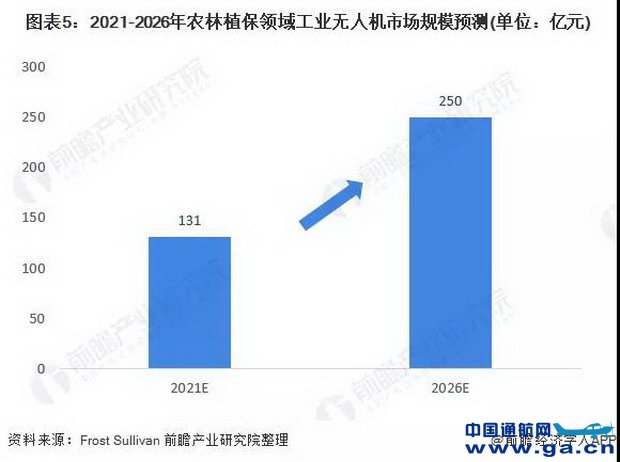而进入2021年,行业更多机遇也是加速凸显。例如,疫情带来的影响就未曾完全消失,无人化作业需求和粮食安全带来的挑战依然存在,这将持续推动植保无人机的发展与应用。在此情况下,可以预见今年植保无人机应用将再创新高。Frost&Sullivan机构预测,2021年,我国农林植保领域工业无人机市场规模约达131亿元,2026年约达250亿元。(原题:2021年中国工业无人机行业市场现状及发展前景预测农林植保工业无人机稳步发展)