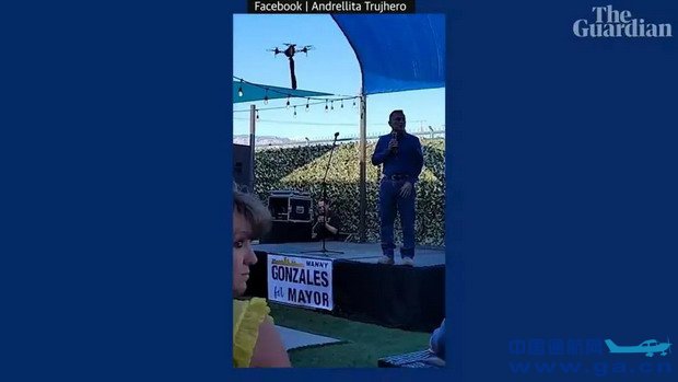 美国一场竞选活动上发生了一件尴尬事:一位新墨西哥州警长正在竞选阿尔伯克基市长的活动上发表讲话,突然飞来一架挂着有情趣玩具的无人机,还有一名男子挥舞拳头并称他为“暴君”,场面一度混乱不堪。