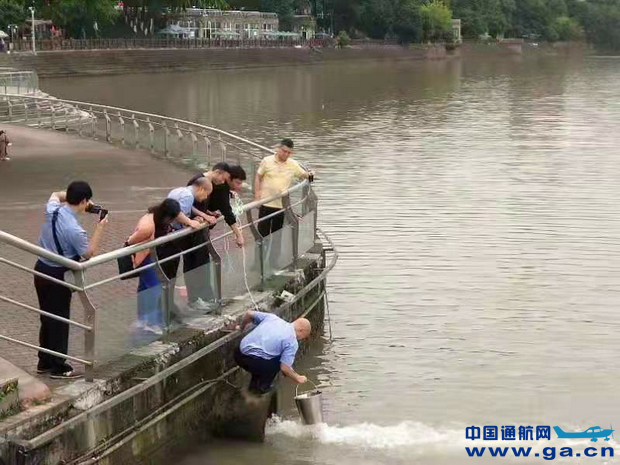四川省雅安市检察院“快检室”技术人员对污水进行采样。