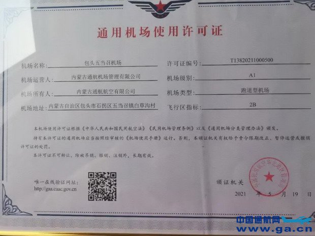 据了解,包头五当召机场位于石拐区五当召镇,是目前自治区唯一一家民营企业全资投资建设的通用航空机场,由内蒙古通航航空有限公司投资建设。在石拐区委、区政府和民航管理部门的支持和帮助下,项目于2014年开始进行前期工作,相继完成了项目选址、环评、民航、军方等一系列工作,于2016年经自治区人民政府批复核准,并于同年9月开工建设,被列入自治区“十三五”航空发展规划及包头市重点项目。机场距包头市政府30公里,毗邻包石一级公路,标高1416米,飞行区等级2B,跑道长1200米、宽30米,设6个B类机位,并配套气象观测、动力站、特种车库等附属设施,航站楼面积2750平方米,与塔台合建。2020年10月,机场场道、飞行区及航站楼全部完工,空管、气象等设施设备已达到使用条件,于2020年12月通过民航内蒙古监管局使用许可审定。此次获得《通用机场使用许可证》,是内蒙古第9个取证的A1类通用机场项目。