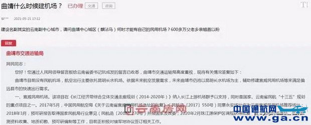近日,就网友问询的“曲靖什么时候建机场”,曲靖市交通运输局回复称,曲靖目前虽然没有民航机场,但根据未来航空发展需求,将修建宣威民用机场等来满足偏远县市的快速出行需求。