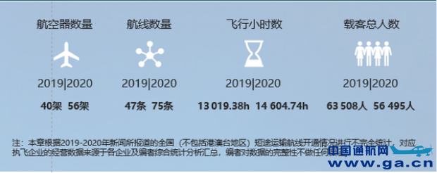 2020年短途运输发展的总体情况是,当年投入到短途运输的航空器数量较2019年增长了16架,航线数量增长28条,受新冠肺炎疫情影响,虽然飞行小时数增加了1600小时,但是在客人数减少7000人次。