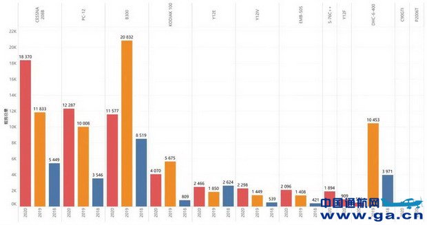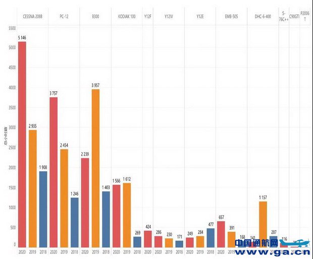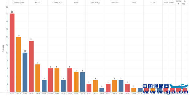 2020年,参与短途运输业务的通用航空器累计56架,较2019年增加16架,增长率为40%;共涉及10个机型系列,较2019年增加了3个机型系列。机型统计中首次出现直升机,国产飞机Y12F正式开展短途运输业务。CESSNA 208B和PC-12两款机型数量的增长速度明显加快,高于所有机型平均增长率。