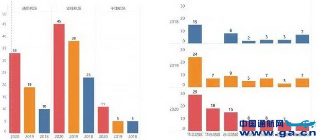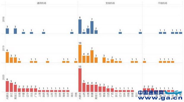 2020年,依旧是华北地区开通短途运输的支线机场数量最多,除新疆地区外,其余地区开通短途运输航线的的支线机场数量同比增加或持平;所有地区开通短途运输的通用机场数量同比增加或持平,华北地区排名第一;所有地区开通短途运输的干线机场数量同比增加或持平,华东地区的数量最多。