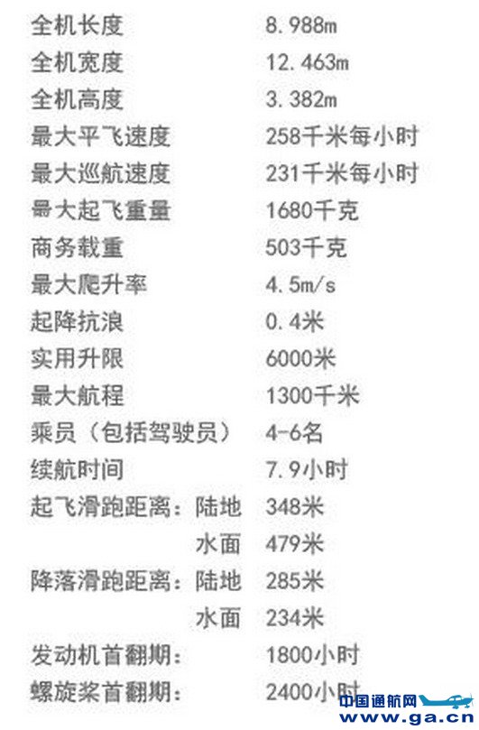 据航空工业通飞官网公布的资料显示,海鸥300飞机是由中航工业石家庄飞机工业有限责任公司和中航工业特种飞行器研究所联合研制的水陆两栖飞机。该机按单驾驶体制、双操纵设计,采用悬臂式中上机翼、“十”字型尾翼、高置单发、前三点可收放式起落架、船身式布局形式,拥有我国完全自主知识产权,设计和制造符合中国民航CCAR-23-R3要求。海鸥300飞机起飞、降落滑跑距离短。陆上可在水泥、沥青等简易跑道起降;水上可在长800米、宽50米、深1.0米、净空条件允许的海湾、江河、湖泊、水库等水域起降。该机是平原、水乡和有水域的边远山区快速轻便的理想作业和交通工具。通过简单改装可完成旅游观光、教学训练、体育娱乐、农林作业、航测、航拍等领域的飞行作业。