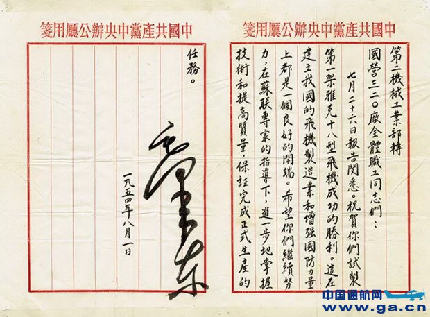 ![]() 航空工业总助级高管、总部相关部门和所属相关单位的领导;湖南省委省政府及省直有关部门领导、韶山管理局有关领导参加捐赠仪式。 航空小贴士 这是一张毛泽东主席签署给320厂全体职工的嘉勉信,毛主席在信里说:“这在建立我国的飞机制造业和增强国防力量上都是一个良好的开端。”