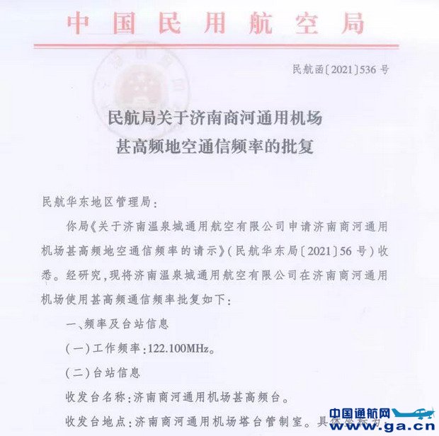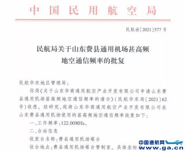 记者从中国民航局最新获悉,该局批复了山东省两座在建通用机场本场频率,分别为费县通用机场122.00MHz、商河通用机场122.100MHz。这标志着上述两座通用机场有了身份呼号,是下一步开航运营的必备条件。 据珠海中航通用机场管理有限公司高级经理方小宁介绍,无线电频率受电磁环境的影响,目前是稀缺资源,民航局针对通用机场设定了专用的使用频率,民航局无线电管理部门根据通用机场所处的地理位置及电磁环境分析确定该机场使用的频率,确保本场地空通信干扰度减少到最低。