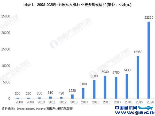 随着无人机在影视航拍、各类监测巡检、农林植保、测绘、物流、抢险救灾、文娱宣传等领域的广泛应用,资本市场对于无人机行业的投资热情也被充分调动。根据前瞻产业研究院《中国无人机行业市场需求预测与投资战略规划分析报告》的数据显示,尽管受制于新冠肺炎疫情和中美贸易战的影响,但截至2020年末,无人机行业投资额依旧达到了23390亿美元,年度总投资不仅创下了最新纪录,还突破了20000亿美元的大关。10年内复合增速更是突破了50%达到51.8%,投资额较2010年增长近6400倍。