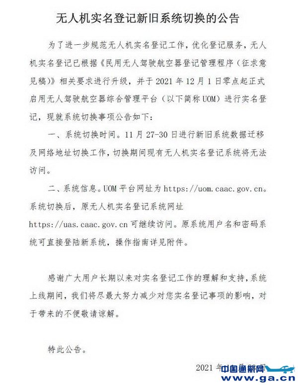无人机实名登记新旧系统切换的公告