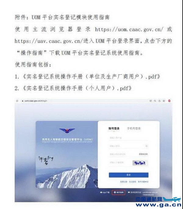 使用主流浏览器登录https://uom.caac.gov.cn/ 或https://uav.caac.gov.cn/进入UOM 平台登录界面,点击下方的“操作指南”下载UOM 平台实名登记系统使用指南。