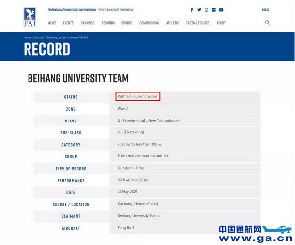 10月1日国际航空联合会(FAI)正式认证了北京航空航天大学 “冯如三号”团队创造的25-100kg级油动固定翼无人机续航时间 新的世界纪录
