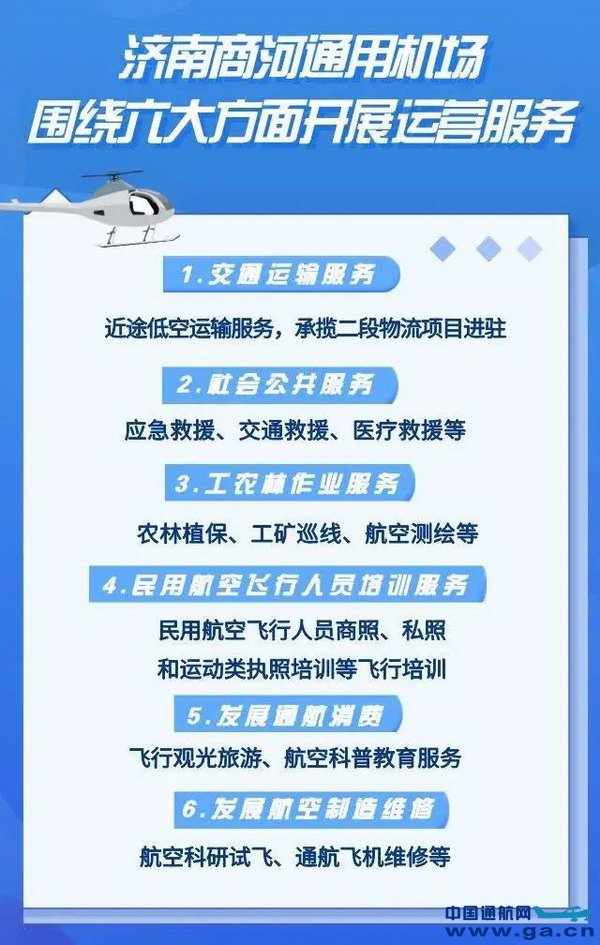 1月7日,民航华东地区管理局为济南商河通用机场颁发《A1级通用机场使用许可证》,标志着济南商河通用机场符合民航局规章运行要求,通航产业的落地与发展将加速启航。