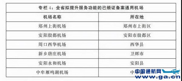 规划中提到,要争取国家政策支持,引导调动企业及社会力量,建成安阳林州、郑州登封、洛阳万安、驻马店平舆、商丘民权等通用机场。开工建设周口鹿邑、信阳商城、洛阳洛宁、焦作孟州等通用机场。 支持信阳新县、鹤壁浚县、焦作解放区、濮阳南乐、南阳镇平、新乡封丘、新乡辉县等有条件的县(市、区)积极开展通用机场建设研究,具备条件后启动前期工作。 在重点县(市)、产业(农业)园区和旅游景区规划建设通用机场或通航起降点,鼓励在偏远地区、革命老区和地面交通不便地区规划建设通用机场。支持部分运输机场增加通用航空设施,鼓励条件较好的通用机场改造发展为支线机场。 顶端新闻·河南商报记者注意到,规划中提到的在建、研究建设的通用机场达到14座。 ![]() 上街、西华等6座通用机场的服务能级将进一步提升