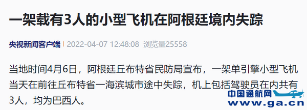 当地时间4月6日,阿根廷丘布特省民防局宣布,一架单引擎小型飞机当天在前往丘布特省一海滨城市途中失踪,机上包括驾驶员在内共有3人,均为巴西人。