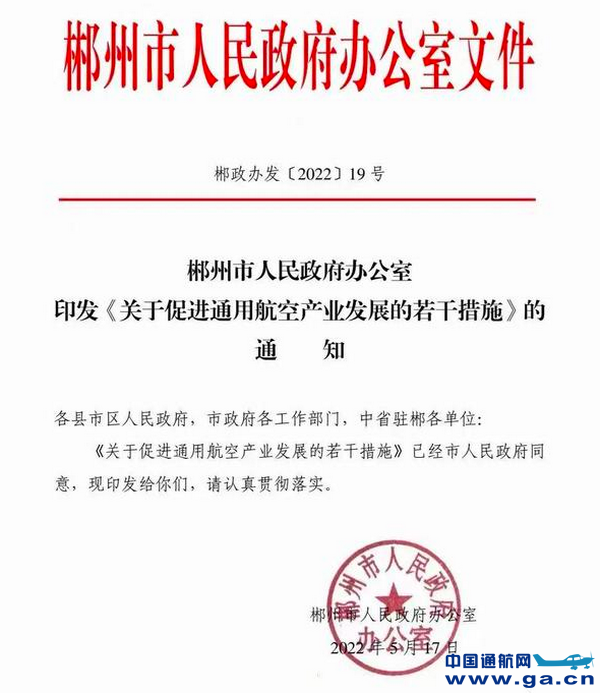 5月17日,郴州市人民政府办公室印发《关于促进通用航空产业发展的若干措施》的通知,全文如下: