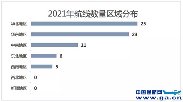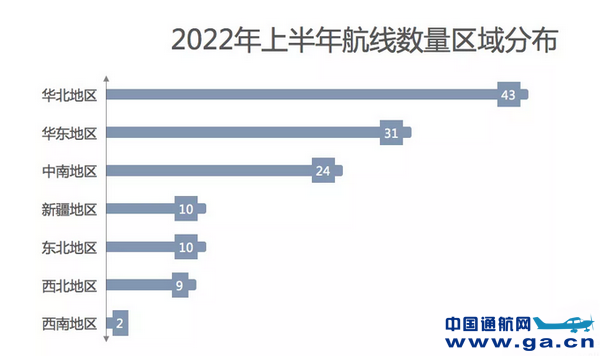 从地区来看,华北地区通航航线数量最多,43条航线;其次是华东地区,31条航线,中南地区次之,24条航线。