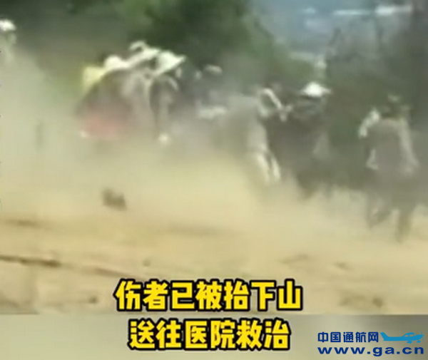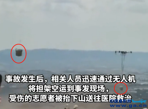 事故发生后,相关人员迅速通过无人机将担架空运到事发现场,随后受伤的志愿者被抬下山送往医院抢救。