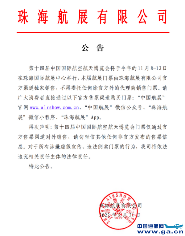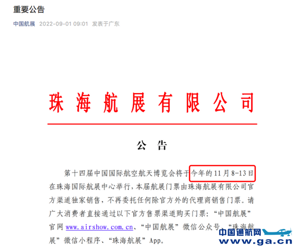 来源:珠海航展 2022年9月1日,中国航展官方发布重要公告,第十四届中国航展(珠海航展)将于今年的11月8日-13日在珠海国际航展中心举行。 在此之前,业内人士纷纷猜测珠海航展是否可以如期举行,今日,官方公告来了。11月8日-13日,珠海见。 官方公告如下: