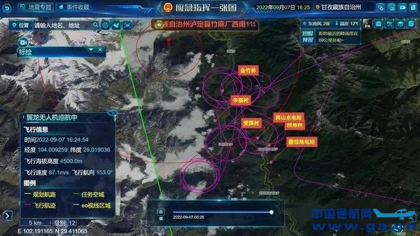 9月5日15时57分,翼龙-2H无人机从安顺黄果树机场起飞,到达任务区后随即进行侦察和应急通信保障任务。先后完成在泸定县磨西镇、王岗坪乡等地通信保障、灾情侦察、370M集群和提供移动语音数据的任务。