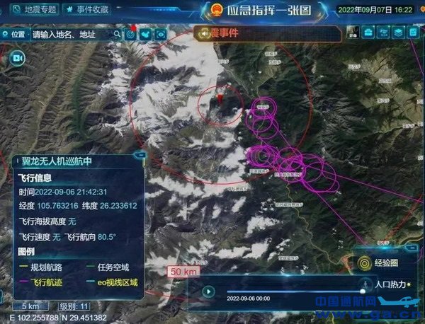 2022年9月5日12时52分,四川甘孜州泸定县发生6.8级地震,在国务院抗震救灾指挥部的统一领导下,在工业和信息化部、军民航各级空管部门的大力协作下,应急管理部紧急调派航空工业翼龙-2H应急救灾型无人机前往灾区执行应急救援任务。航空工业高度重视,中航无人机团队闻令而动,与空军试飞局第五大队、中国移动、贵飞等单位紧密协同,三小时完成起飞前全部准备工作,第一时间抵达灾区、第一时间恢复灾区通信、第一时间建立370M专网通信。协助应急管理部构建应急指挥通信网络,协助应急救援工作开展。