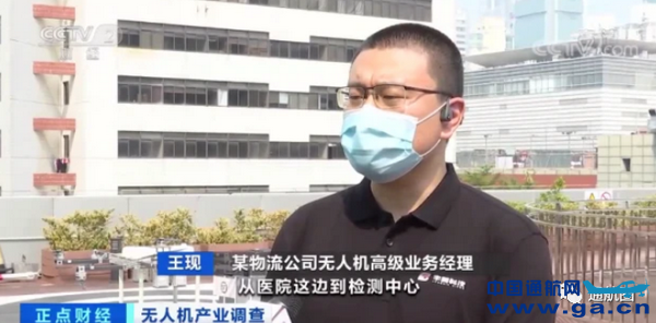 某物流公司无人机高级业务经理 王现:从医院到检测中心,地面的交通距离大概是15公里,飞行距离大概是10.3公里,无人机首先是速度比较快,其次不会受交通状况影响,原来一个小时的运输时间缩短到了15分钟以内。