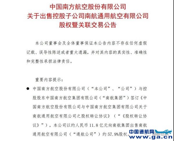 南方航空拟以11.8亿向南航集团出售通航公司约57.9%股权
