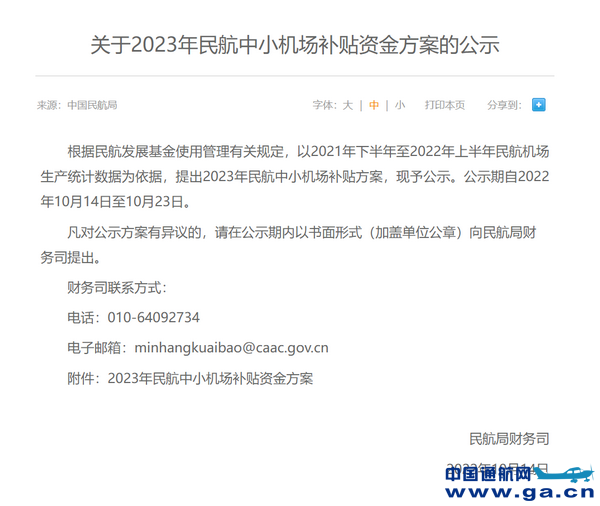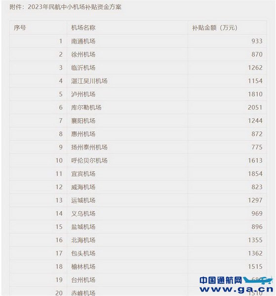 2022年10月14日,民航局财务司公示《2023年民航中小机场补贴资金方案》。方案中显示,180家中小机场共计补贴资金178530万元(约17.9亿元,三区三州机场补贴方案待审定后另行公示)。其中,16家通用机场拟获补贴资金共计3528万元。公示期自2022年10月14至10月23日。 16家获补通用机场清单如下: