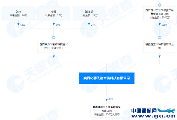 根据天眼查显示,该公司的股东为张炜等人投资的西安泰力飞智能科技合伙企业(有限合伙)和西工大旗下的陕西西工大科技园有限公司。西工大科技园在今年1月曾推文表示:“1月27日,西工大航空学院张炜团队以无人机飞行控制系统设计及仿真技术的相关成果作价投资组建的创新科技型企业——陕西化羽先翔智能科技有限公司注册成立。这是西工大科技园促进科技成果转移转化,服务地方经济发展的又一喜人成果。”当时该团队的目标是瞄准未来民用无人‘物流快递’、‘应急救援’的蓝海市场,以垂直起降型支线物流无人机及其系统设备设计、服务与销售为主业,以多系列、高负载、长航时机型为主要产品研发方向,旨在带动无人物流领域产业发展,将化羽先翔打造成为行业排头兵,开创属于自己的一片蓝海。“
