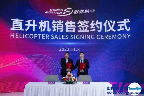 2022年11月8日,第十四届中国国际航空航天博览会(珠海航展)开展首日,上海啸翔通用航空服务有限公司(上海啸翔)与多弗航空产业集团(多弗航空)旗下温州多弗航空产业集团有限公司达成20架直升机意向订单採购协议,多弗航空迎来开门红。