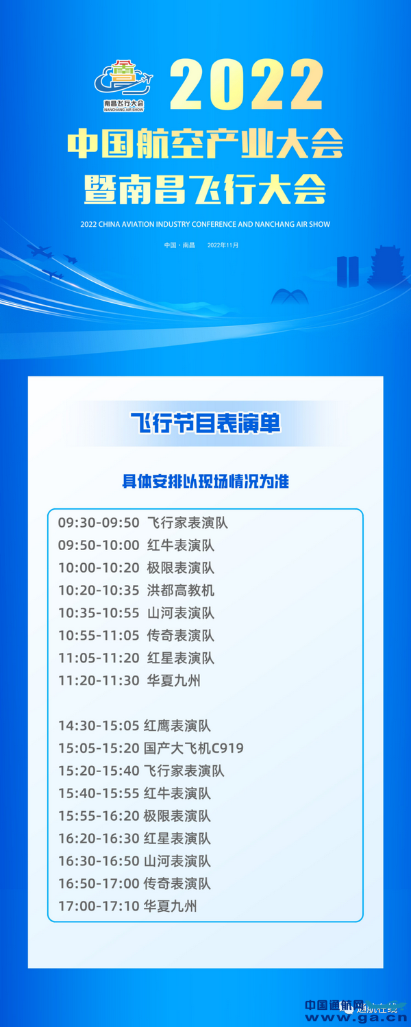 ![]() 11月25日-11月27日,2022中国航空产业大会暨南昌飞行大会(以下简称"南昌航展”)节目表演单现已出炉,一起来看看吧。
