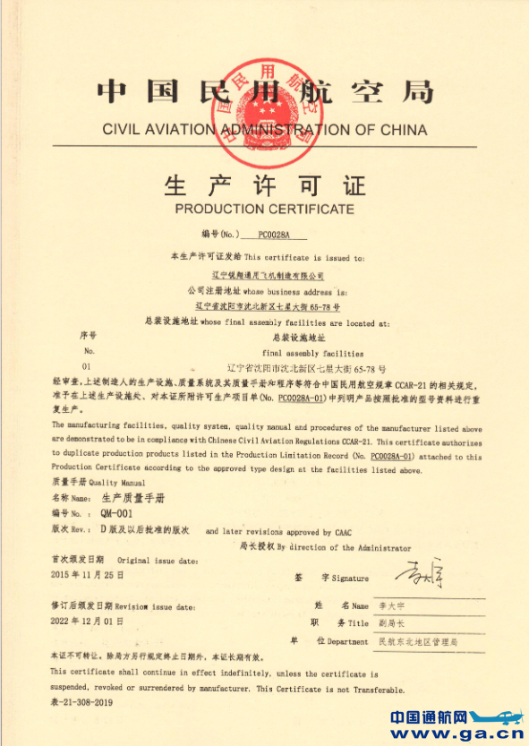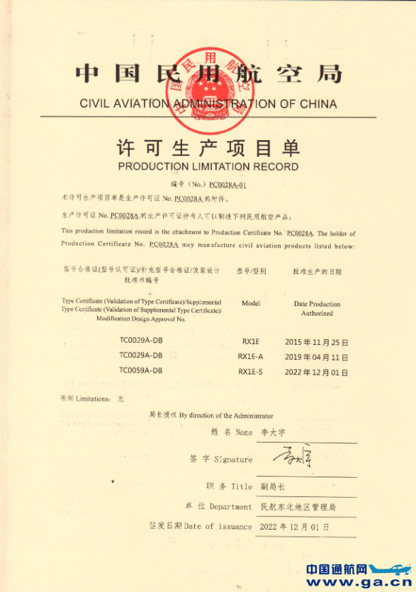 据悉,辽宁锐翔通用飞机制造有限公司(简称“辽宁锐翔通飞”或“锐翔通飞”)2022年4月22日向东北管理局提交了生产许可证(PC)申请书及相关资料,管理局审查组于2022年4月24日受理并正式启动该项目的审查,并将RX1E-S型水上电动飞机生产许可增项审查列为东北管理局2022年重点审查项目之一。