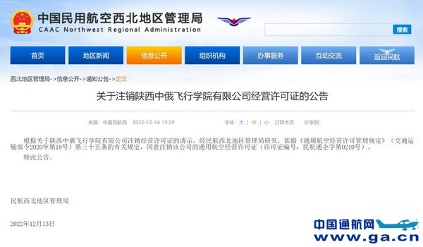 民航西北管理局12月14日发布公告,注销陕西中俄飞行学院有限公司、青海霁予通用航空有限公司的通用航空经营许可证。