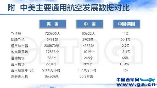 需要说明的是,美国现有的19853个起降场中,私人机场为14784个,公用机场5069个。在公用机场中,列入美国国家规划的机场是3287个,其中,运输机场383个,通用机场2904个。如按此计算,我国运输机场约占美国的65%;通用机场约占美国的13.4%。