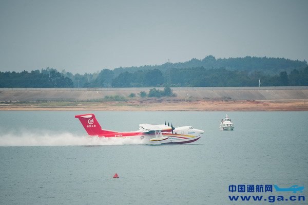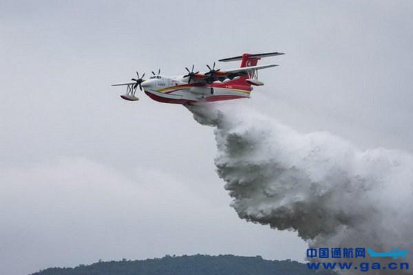 ![]() 国产大型灭火/水上救援水陆两栖飞机AG600M进行飞行投水演示。新华社记者 刘大伟 摄