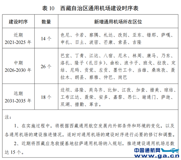 近期目标(到2025 年)——夯实发展基础,大力推进通用机场及配套保障设施建设:西藏应急救援基地拉萨通用机场建成并投入使用,完成林芝米林、昌都邦达、阿里昆莎、日喀则和平4个现有运输机场通用航空功能改造和定日、隆子、普兰3个新建运输机场通用航空功能建设,力争新建14个通用机场,按需建设200个左右停机坪(含第三方需求),重点打造以拉萨通用机场为基地的应急救援网络,明确航空应急救援运行体制和政策制度,建立航空应急救援空中力量建设与发展机制,在应急救援、森林消防、警务飞行、医疗救护等公共服务领域充分发挥积极作用,同时试点开展短途运输、空中游览等业务,确立通用航空服务在西藏地区的发展路径。加强人才队伍建设及空管、航油等配套工程的规划和建设。