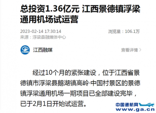 新华社客户端丨总投资1.36亿元 江西景德镇浮梁通用机场试运营 新华社客户端 人民日报客户端 央广网 学习强国 经过10个月的紧张建设,位于江西省景德镇市浮梁县鹅湖镇高岭中国村景区的景德镇浮梁通用机场一期项目已全部建设完毕,已于2月1日开始试运营。 据了...